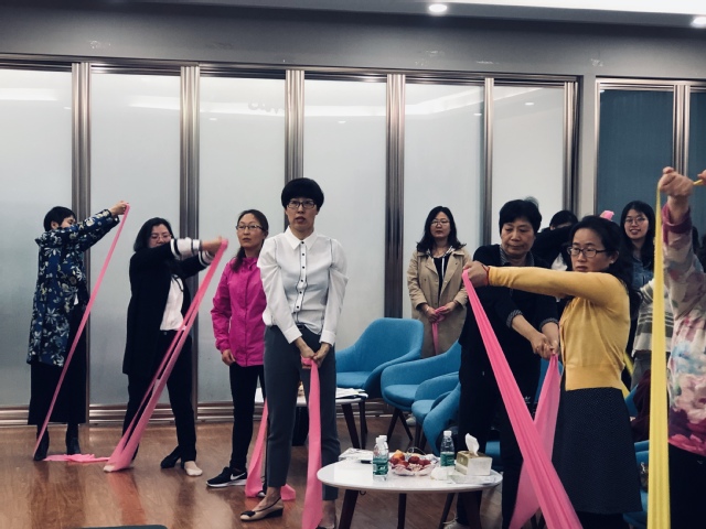 本场活动的主讲嘉宾是徐州市康复医院的陈伟副院长。陈院长是徐州市中心医院康复医学科主任、徐州医科大学康复治疗学专业负责人,中华医学会物理医学与康复学分会心肺康复学组委员、中国医师协会康复医师分会常委等,在亚健康人群运动干预临床研究等方面拥有丰厚的学术积累与实践研究经验。她通过大量直观的图片、妙趣横生的语言,向在场的女教职工娓娓道来健康康复的相关知识,大家兴趣浓厚,不时被陈医生的幽默风趣逗得哈哈大笑。之后配合着教学视频,康复医院的专业康复师带领大家进行身体辅助动作练习,这个环节瞬间点燃了讲座的气氛,大家纷纷拿起配发的瑜伽带跟着专业运动康复师一起练习相关动作,踊跃交流运动体验,活动室中充满着欢声笑语,互动现场气氛轻松活跃。讲座在快乐的氛围中圆满结束。