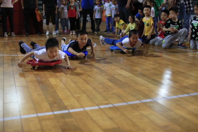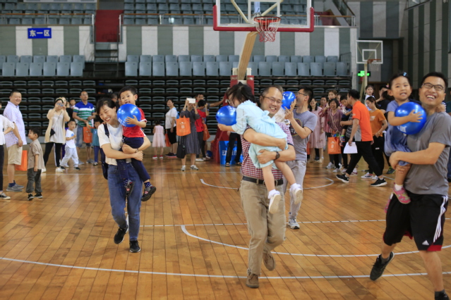 本次亲子运动会是我校举办的第二届亲子运动会,与上届相比,参与人数更多,规模更大。参赛选手全部由我校教职工子弟中6个月~6岁以下的孩子组成,按照小朋友不同的年龄阶段,运动会精心设计了“赛龙舟”“大企鹅赛跑““爱的巴士”“疯狂的赛车”等八种游戏,家长和孩子们热情高涨地参与其中,竭尽全力,各展所能。2岁以下“小宝贝组”的参赛选手大多是6个月龄的小朋友,在“大企鹅赛跑”项目中,家长抱孩子站立,双腿间夹球,保持球始终不能落地,向终点前进,孩子们都用小手紧紧抱住父母,努力合作!小朋友们认真的表情,极具趣味性;在2~3岁“小飞侠组”的“宝贝传递”项目中,家长和小朋友面对面在跑道首尾站立,家长从起点开始飞奔到对面接孩子,双手握住体能环不可以触碰孩子身体,家长和孩子齐心协力,体会默契、感受运动的快乐……场馆内处处洋溢着欢声笑语,晃动着孩子们天使般的笑脸。