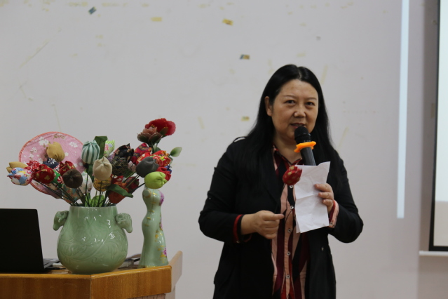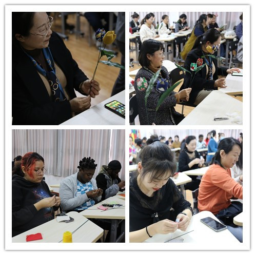 本次活动特别邀请国际学院郭晶萍老师担任主讲教师。郭老师首先概述了女红在中国传统文化地位和古典诗词中的记载,然后用实物和照片,展现了她设计制作的手工作品,并对布艺色彩元素及图案风格进行了细致介绍及制作演示。在座的师生们拿着事先准备好的材料袋,经过缝制、裁剪、压边等步骤,用不同颜色缝制郁金香,最后将绿叶置于花朵下方缝制,一朵朵栩栩如生的郁金香成型。学员们认真制作,相互帮助,互相称赞,活动现场一片欢声笑语。