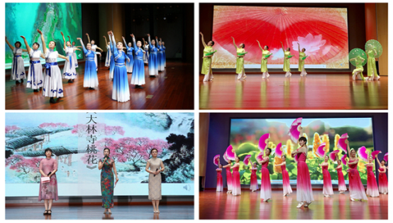 本次汇报演出呈现了过去一年协会的主要成果。《问花》《又见江南雨》《梨花情》《芙蓉雨》《紫薇花开》等舞蹈用不同的扇子展现不同的舞蹈韵味,长扇如云霞飘飘,折扇如彩蝶飞舞,时而柔美,时而刚劲,罗扇油伞,异彩纷呈。《美丽的草原我的家》《圆舞曲》则是用不同风格的舞蹈作品,展示了舞协最新的学习成果。文晓华老师为大家《说扇》带领观众走进扇子的前世今生;外院三位会员老师用英文朗诵的中国古典诗词让大家感受到别样的语言魅力;《旗袍秀》的10位老师将小小折扇与旗袍相结合,演绎出万种风情;音乐学院高静教授的一曲《我和我的祖国》将全场演出推向高潮,在场的师生们以热情激昂的歌声,为祖国献上最真切的祝福。最后出演的是在2018年全国健身秧歌大赛(武汉赛区)上获得一等奖的节目:胶东秧歌《紫薇花开》。