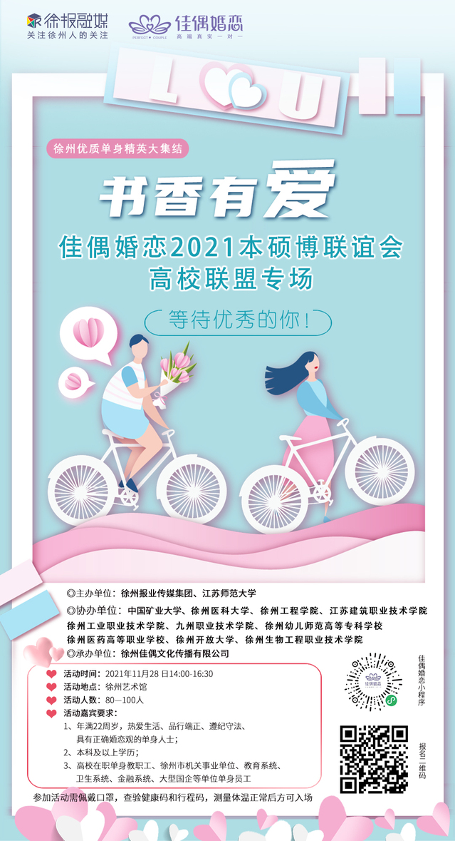 为给在徐高校单身教职工搭建相识相知、沟通交流的平台,促进青年教职工解决生活情感难题,提供增进了解的机会,由徐州市报业集团、江苏师范大学主办,徐州佳偶文化传播有限公司承办,在徐11所高校共同参与的“书香有爱”——2021本硕博联谊会”高校联盟专场”活动近期举办。相关事宜通知如下(详见活动海报):
