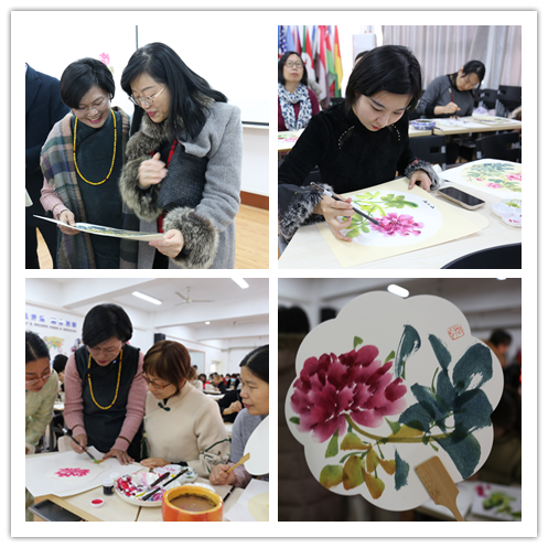 张勤老师首先从团扇发展的历史、类型以及团扇寓意等方面展开详细的讲解。团扇是中国古代常用的扇子,是我国的民间艺术品,有着深厚的文化底蕴,是汉文化的组成元素之一。团扇代表着团圆美满、吉祥如意,体现了中国传统文化高级的审美情趣、思维方式所凝聚而成的精神内涵。在绘画实践环节,张勤老师教授了扇面绘画的结构设计、色彩搭配以及国画写意的手法,带领大家在团扇上勾勒起牡丹的形状。在场的老师们热情高涨,纷纷拿起毛笔直抒胸臆。一小时后,一把把栩栩如生的牡丹团扇赫然而生。