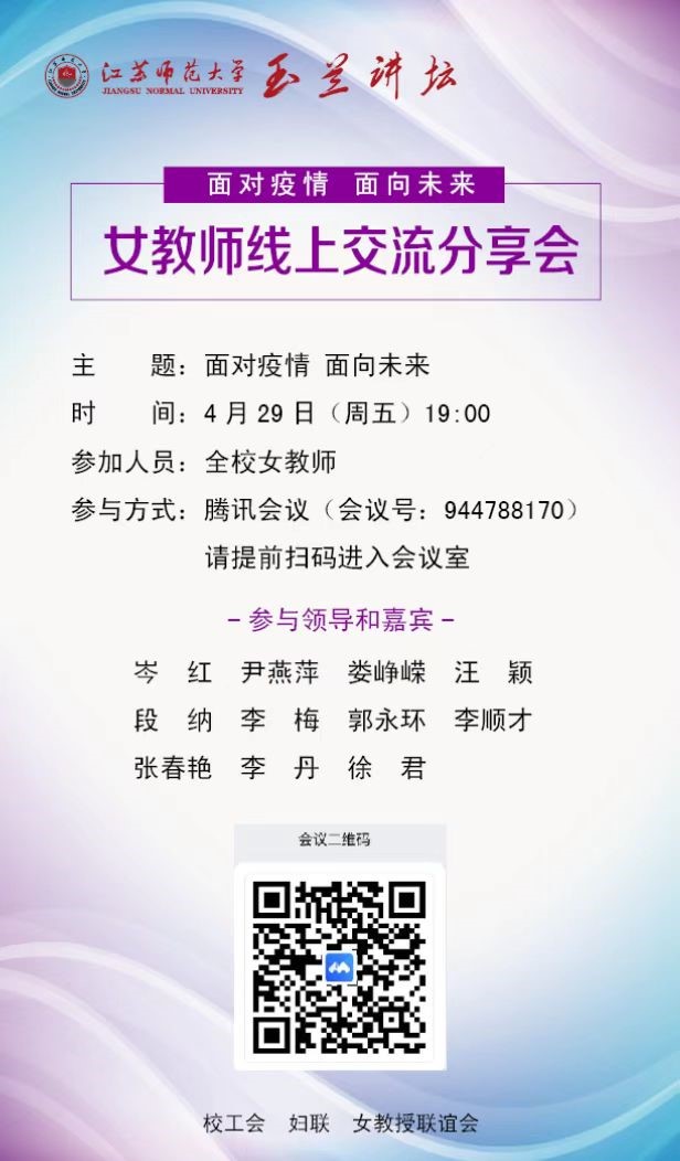 新一轮疫情发生以来,我校女教师坚守在不同岗位上,承担着非常时期的各项重任。为进一步凝聚巾帼力量,充分发挥榜样引领的积极作用,4月29日晚上,校工会、妇联、女教授联谊会共同举办“玉兰讲坛·面对疫情 面向未来”女教师线上交流分享会。校党委副书记、女教授联谊会会长岑红参加活动。来自全校各单位的近200位女教师汇聚云端,交流疫情之下工作与生活的体验与感悟,共话美好未来。校妇联负责同志主持活动。