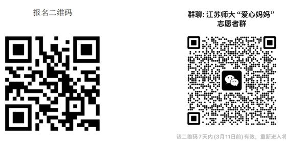 七、报名方式:请确定参加的女教职工,于4号下午14:00之前扫码填写报名信息(额满即止),并加入“江苏师大‘爱心妈妈’志愿者群”,后续事宜将在群内通知。