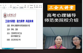 距离2022年高考仅剩不到半个月的时间,高考前的心理焦虑、学业困境等问题在高三学生中时有发生,广大陪考家长也正处于迷茫当中。为有效缓解教职工高考家庭的心理压力,为家长提供正确的陪考知识,助力顺利冲刺高考, 5月21日晚,校工会、徐州市教育工会联合举办“工会大讲堂:助力高考,共话未来——高考心理辅导与师范类院校介绍”公益直播活动。我校教育科学学院心理学教授李梅及生命科学学院党委书记、教育技术学教授汪颖担任主讲。直播最高在线观看人员达3000余人。