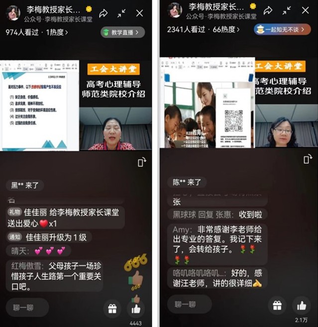 在直播中,李梅教授从高考临考阶段可能出现的各种心理现象入手,深入浅出地对考前出现的紧张焦虑等情绪进行分析和讲解,引导家长与考生科学接受焦虑的合理存在,改变对压力的认知,增强调节压力的能力,保持健康良好的情绪状态;汪颖教授针对近两年大热的师范类院校的发展特点、专业前景、人才培养模式、师范类院校选择等方面,给家长们提出具有参考性的建议。之后两位专家共同在线答疑解惑,针对家长的陪考焦虑,备考困扰、心理疏导等方面问题给予专业而耐心地解答指导,更好地帮助家长了解备考期间孩子的心理,缓解考前压力,科学陪考,正确助力。