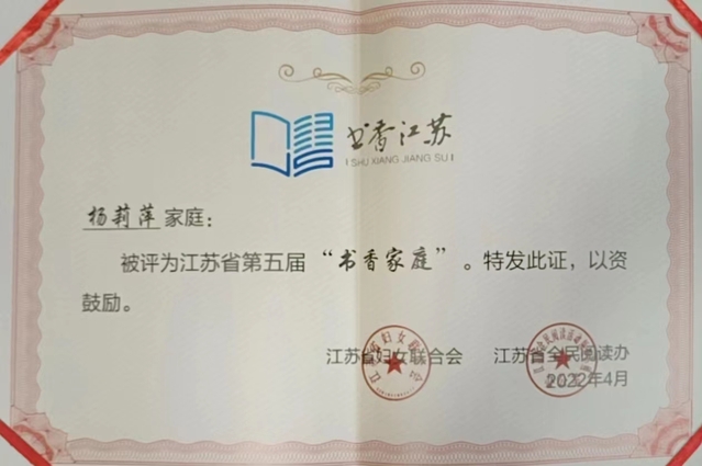 为贯彻落实习近平总书记关于注重家庭、注重家教、注重家风的重要论述,进一步推进“家家幸福安康工程”落地落实,团结引领广大家庭弘扬社会主义家庭文明新风尚,以优异成绩迎接党的二十大胜利召开,近期江苏省妇女联合会在各级各单位常态化寻找、层层推荐申报模范家庭典型的基础上,表彰了100户江苏省第五届书香家庭、100户江苏省五好家庭及200户江苏省最美家庭。我校历史文化与旅游学院杨莉萍家庭荣获江苏省第五届“书香家庭”称号。