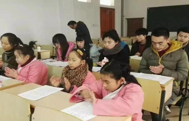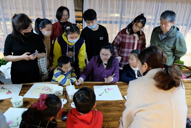 张勤老师在博库书城开展公益教学。后排右二,红格衣者,是就读初二的女儿。女儿从小随妈妈参加各种国学公益活动、书画公益讲座,耳濡“墨”染,喜欢书画;更重要的是,在传统文化的浸染之下,懂得感恩惜福,谦逊阳光。(2020年春)