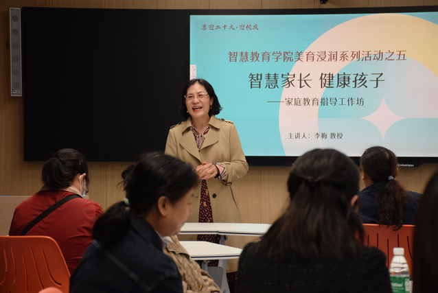 为喜迎党的二十大,塑造良好家风,10月14日下午,校工会、妇联主办,智慧教育学院承办一会一品项目“喜迎二十大 美育浸润”系列活动之智慧家长 健康孩子—家庭教育指导工作坊活动,活动邀请到江苏师范大学心理学教育专家李梅教授主讲,活动在学院智慧教学示范空间进行。