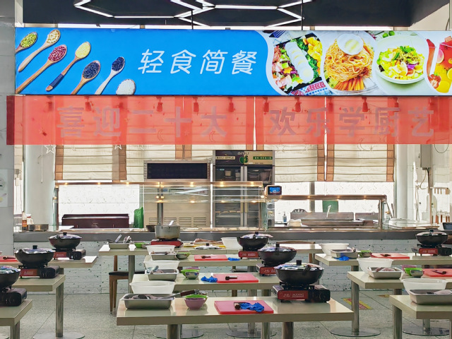 明亮宽敞的大厅、鲜艳醒目的活动横幅、整齐排列的烹饪桌、桌上丰富的食材和厨具,还有一旁散发着淡淡奶香的蛋糕……充分的预热准备让大家对活动的开始愈发迫不及待。伴随着秒针微不可闻的滴答声,老师们陆续到场,热情地交谈,等待活动开始。