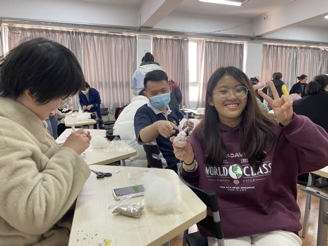 活动前,李丹副书记隆重介绍了本次活动的主讲人——宋波老师。宋老师是徐州著名的非物质文化遗产传承人,也曾多次受邀来到国际学院给老师们传授中华优秀手工艺技法。宋老师首先向大家展示了本次活动需要制作的手工作品——福兔香包,并向老师们科普了香包的由来、功能、结构和基本制作方法。紧接着,宋老师将教师们分为6个小组,分别走到每个小组面前亲自传授制作香包的技法与注意事项。教师们听得十分认真,大家自发地围在宋老师周围,拿着事先准备好的材料袋,按照宋老师教授的步骤一点一点地将布料缝制在一起,塞棉花、装草药、缝兔头…随后,一只栩栩如生的福兔香包就制作成功了。大家十分高兴,恳请宋老师再多传授一些“小手艺”,宋老师便“即兴”为大家示范了中国结的制作流程,并给每位老师分发了一小段红绳做练习,活动在欢声笑语中结束了。