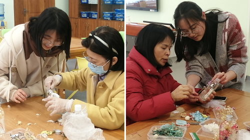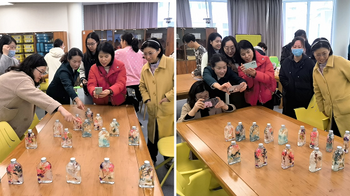 活动前,志愿者们为前来参加活动的老师们准备了干花、甘油、玻璃瓶等材料。活动开始,汪颖书记向各位老师介绍了浮游瓶,它与植物标本十分类似,凸显了生命科学的特点,浮游瓶也可以保存两三年之久。主讲老师讲解了浮游瓶的制作方法,在志愿者们的帮助下,老师们在欢声笑语中制作了许多心仪的浮游瓶。