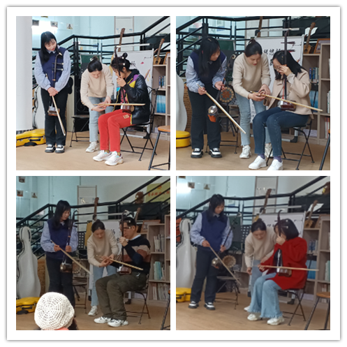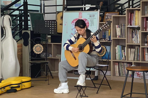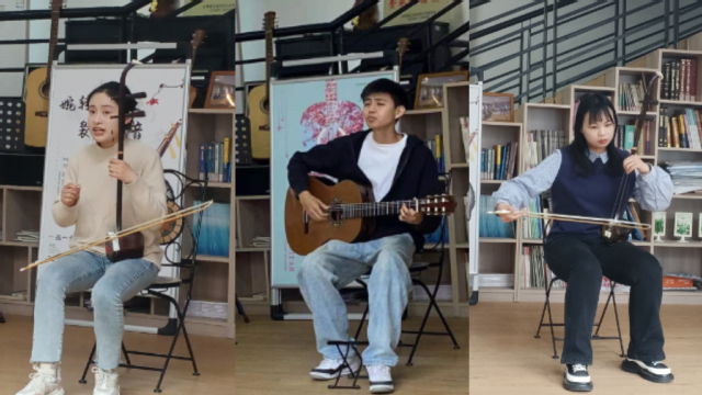 本次活动特邀吴曼妮博士担任嘉宾,张庆新、葛启媛、徐畅三位音乐学院同学参与其中。第一场活动的主题为“弦动木心·指尖流音”,吴老师先讲述了古典吉他的发展史、吉他制作材质的区别等知识,演奏了《爱的罗曼斯》等四五首中外经典音乐作品,张庆新同学弹唱了《再回首》《再见》等作品。第二场活动的主题为“婉转悠扬·袅袅余音”,徐畅同学介绍了二胡历史、形制及音色特点,演奏了二胡经典代表作《三门峡畅想曲》,分析了作品的创作背景;葛启媛同学演奏了《陕北抒怀》《春天》以及罗马尼亚音乐移植曲目,并对乐曲进行赏析讲解;最后两位同学以合奏《赛马》结束了整场活动。参加活动的教工们与音乐学院老师同学积极互动、交流,整场活动气氛热烈,掌声不断。