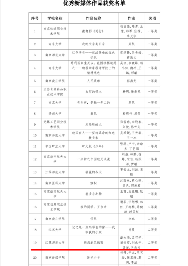 江苏省委教育工委、省教育厅于2022年6月启动了第二届江苏省大学生网络文化节和高校网络教育优秀作品推选展示活动。经过激烈角逐,我校工会、妇联组织拍摄的短视频作品《画您春风拂面》荣获“优秀新媒体作品二等奖”,我校荣获“优秀组织奖”。