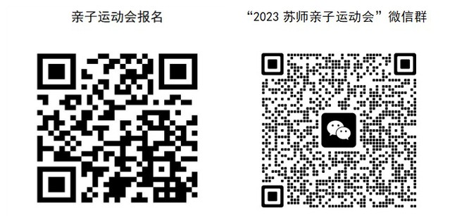 请参加活动的教职工扫码报名,并同时扫码入“2023苏师亲子运动会”微信群,相关信息将在群中发布。每次扫码可报名一位,家有多名适龄孩子参加的可再次扫码报名。报名系统于5月22日(下周一)下午14:00截止,逾期自动关闭,无法补报。