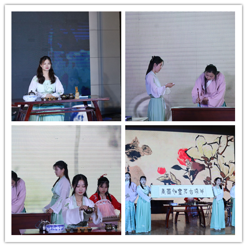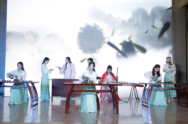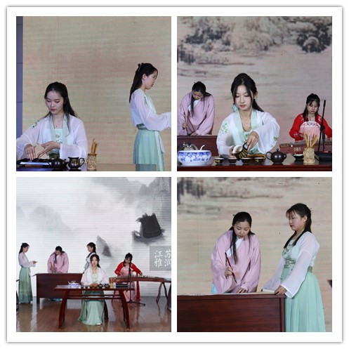优雅而富有韵致的茶艺表演以“半盏古茗,一袖墨香”为主题,将茶艺中的“冰清玉洁——洁具、佳人入宫——投茶、注清泉——泡茶、点水流香——分茶、香茗酬宾——奉茶、收杯谢客——收具”沏茶六步骤融入书法、古筝等艺术形式,并将“淡淡茶香,清纯质朴;浓浓墨香,沉心静气;悠悠琴声,修心养性”的设计理念表现得淋漓尽致,全场以向嘉宾奉茶完美收尾。表演全方位体现以“高雅润泽人生”的学堂宗旨和“博雅艺能”为学习内容的学堂特色,充分展现了当代女大学生朝气蓬勃、积极向上、健康自信、气质慧雅的精神风貌。
