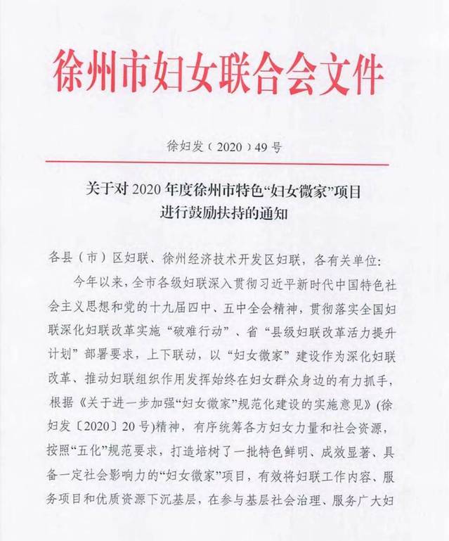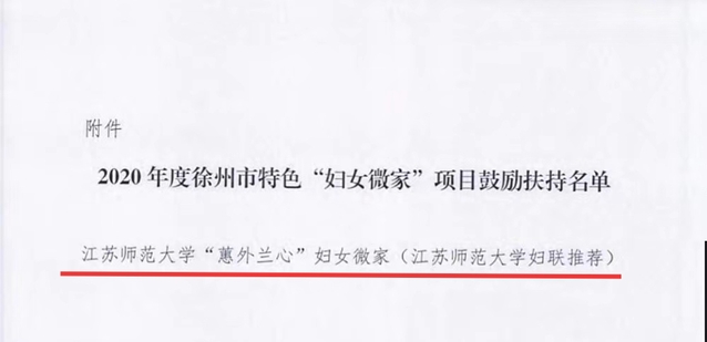 为贯彻落实全国妇联深化妇联组织改革实施要求,进一步打造妇联组织作用发挥始终在妇女群众身边的基层妇联组织建设新格局,徐州市妇女联合会近期评选表彰了一批特色鲜明、成效显著、具备一定社会影响力的“妇女微家”项目,我校“蕙外兰心妇女微家”荣获2020年度徐州市特色“妇女微家”扶持项目(徐妇发〔2020〕49号)。