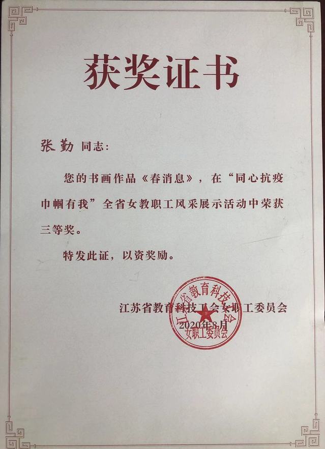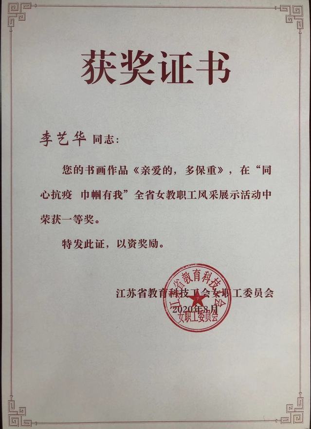 近日,江苏省教育科技工会公布了“同心抗疫,巾帼有我女教职工风采展示”评选结果,我校选送的美术学院李艺华老师书画作品《亲爱的,多保重》荣获一等奖,张勤老师书画作品《春消息》荣获三等奖。