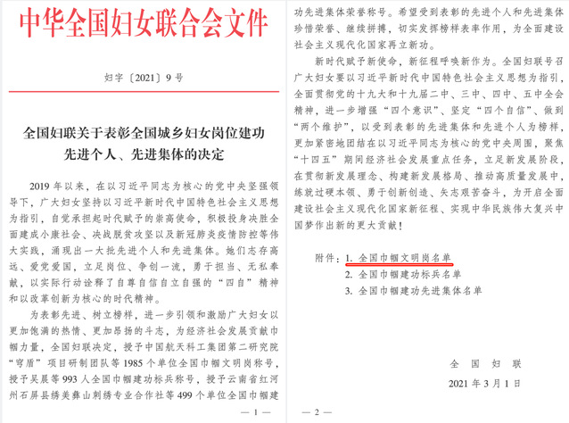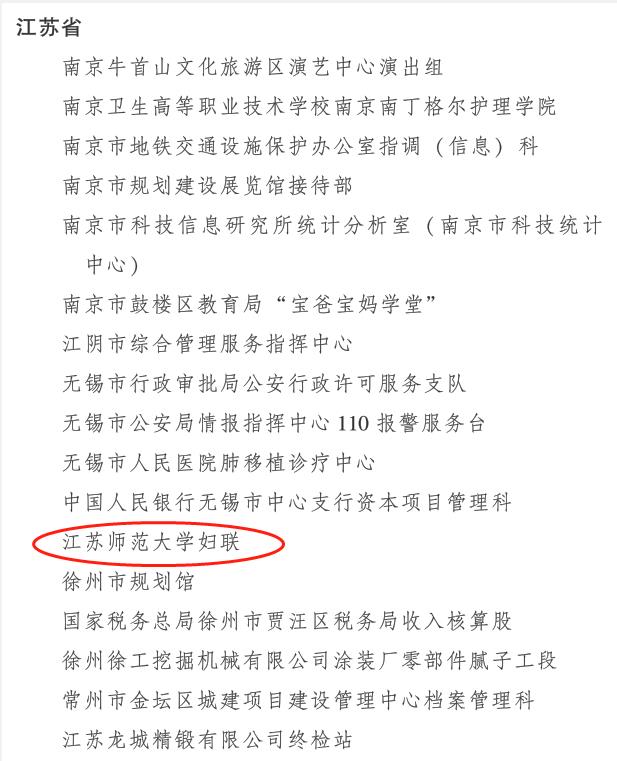 近日,中华全国妇女联合会表彰了全国城乡岗位建功先进个人和先进集体(妇字〔2021〕9号),我校妇联获“全国巾帼文明岗”荣誉称号,是江苏省高校妇女组织中唯一获此殊荣的单位。